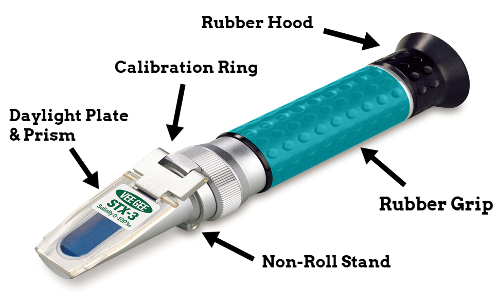 The STX-3 Handheld Salinity Refractometer features the largest, easiest-to-read scale available with clear, sharp figures, screen shading and incredible contrast. This significantly enhances overall precision, even when several different people use the refractometer. The STX-3 also comes with a rubber grip on the body, which blocks the transmission of hand heat to eliminate temperature errors.